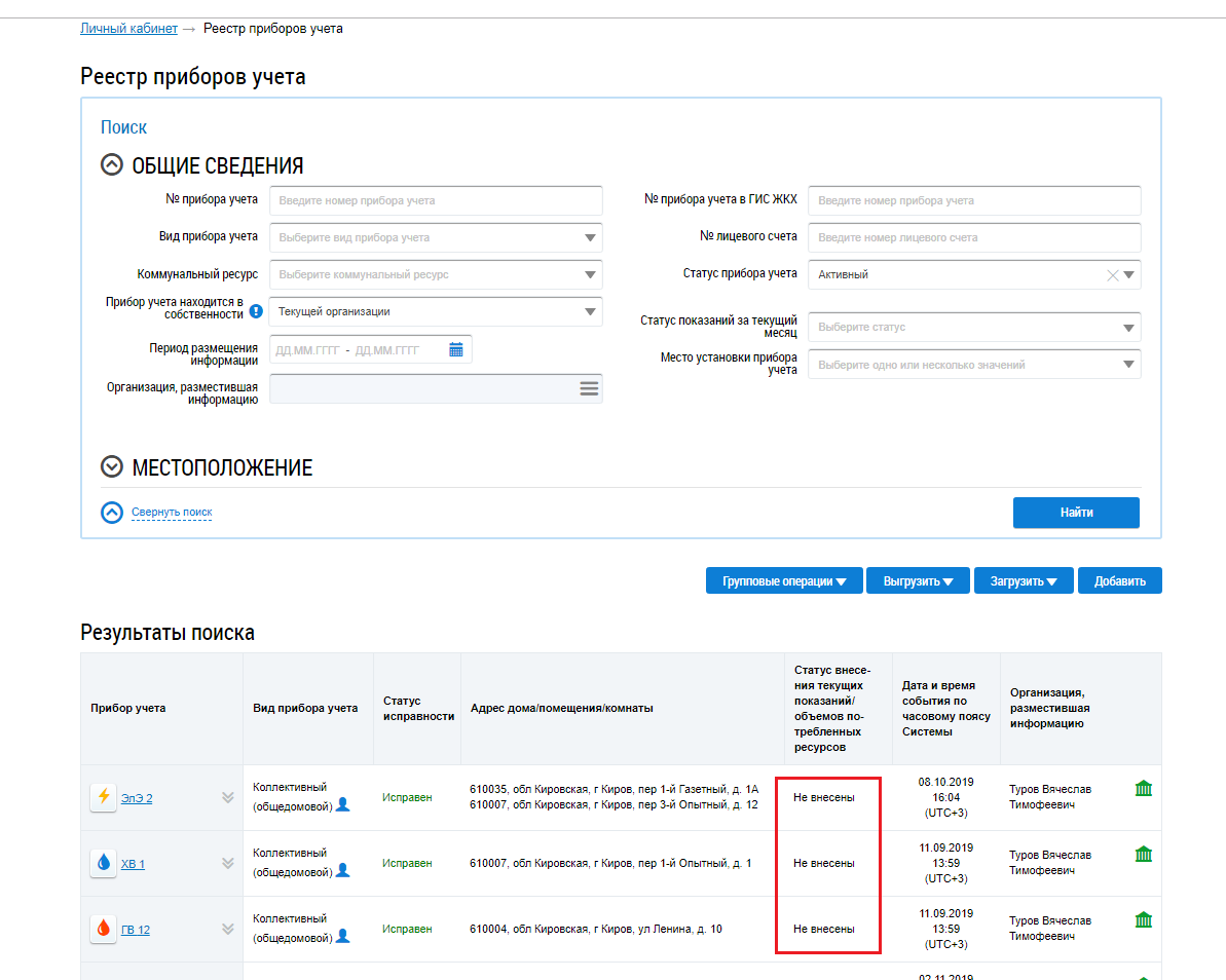 Внесли показания приборов учета. Почему статус внесения текущих показаний/объемов потребленнных ресурсов «Не внесены»?