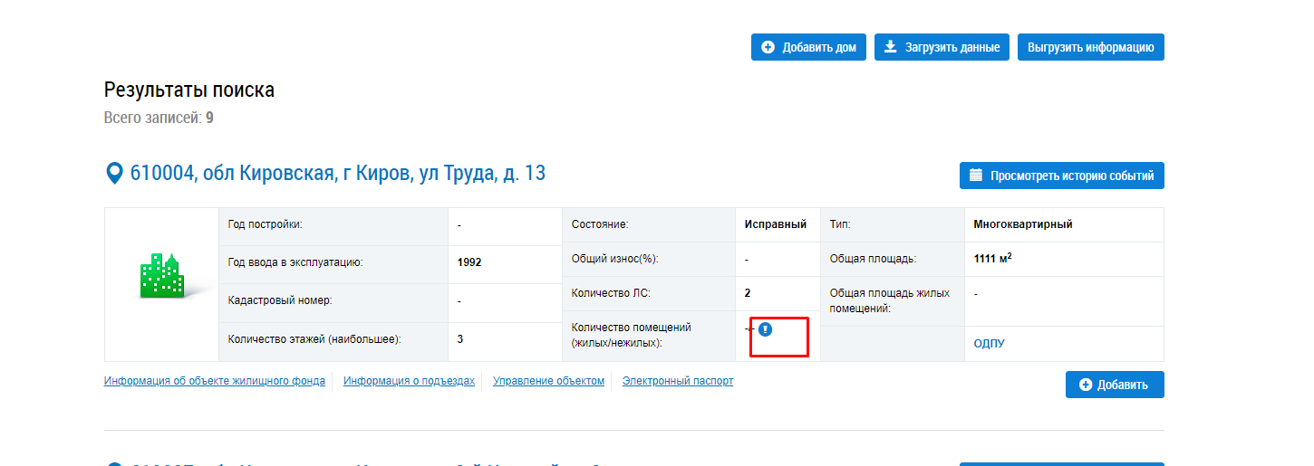 При наведении курсора мыши на информер (синий круг с восклицательным знаком) отображается количество фактически размещенных квартир/помещений из раздела «Информация о помещениях» по данному объекту жилищного фонда.