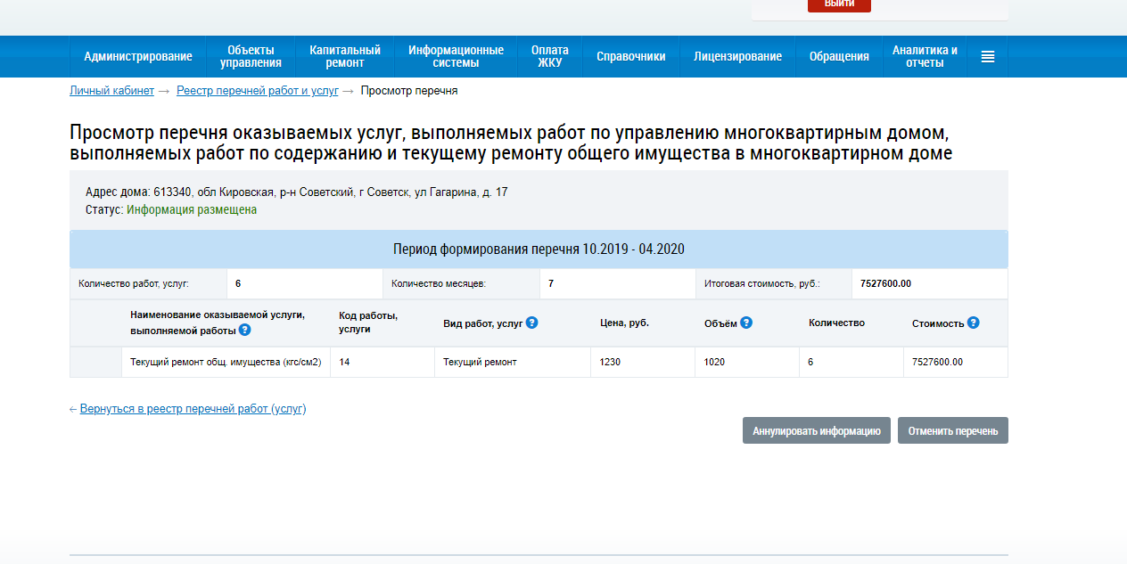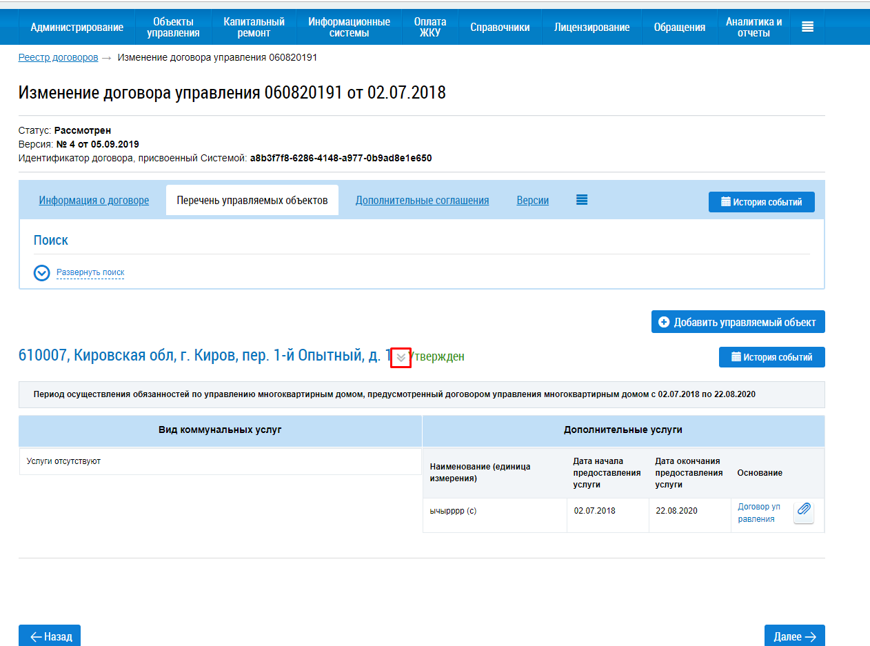 Убедитесь, что период действия перечня входит в период действия договора управления (дата вступления договора в силу — предполагаемая дата окончания).