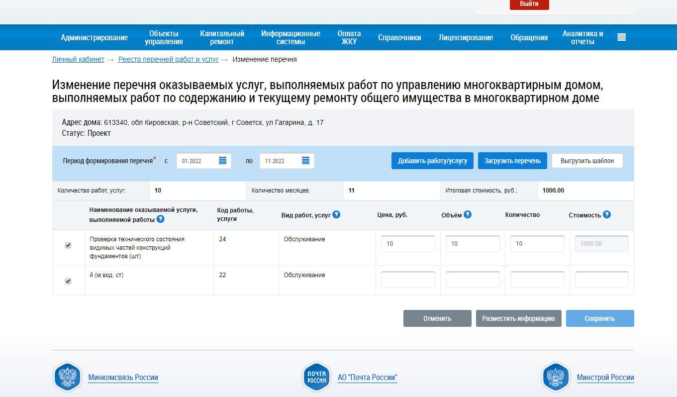Во время размещения перечня работ и услуг система сообщает об отсутствии управления домом (договор управления в статусе «Действующий»)