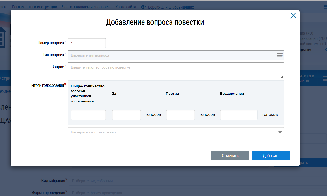 Первый протокол, который должен быть размещен в личном кабинете, должен иметь тип «Выбор способа управления многоквартирным домом». Далее Система позволит размещать протоколы с любым типом вопроса. Размещенный электронный образ протокола в договоре управления на вкладке «Информация о договоре» с выбранным собственниками способом не снимает обязательства размещения отдельной записи о таком выборе во вкладке «Голосование».