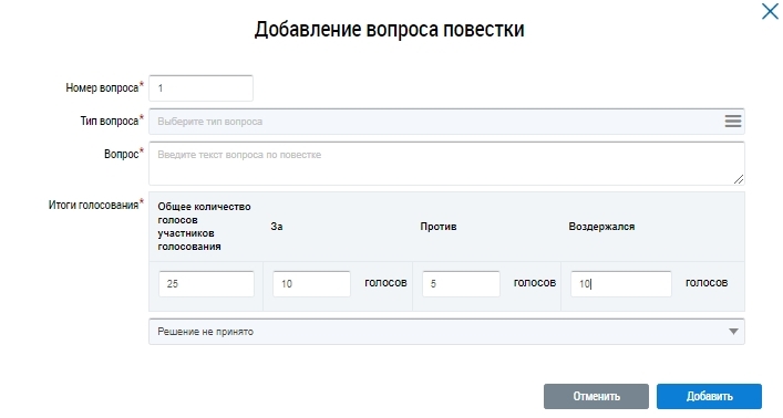 Для того чтобы решение по голосованию считалось принятым, количество проголосовавших «за» должно превышать 50% от общего числа голосующих, в том числе, которые воздержались от ответа. В описанном примере это 13 человек и более. Таким образом, с учетом текущей реализации Системы решение определяется автоматически и недоступно для редактирования.