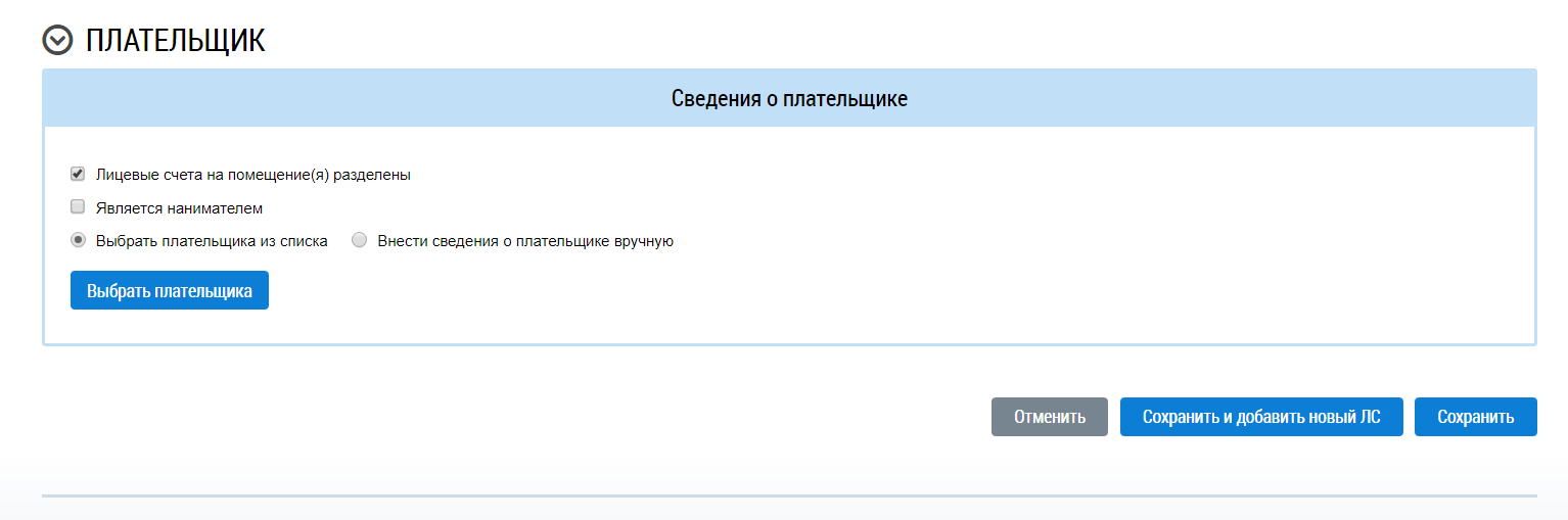 Единый лицевой счет (ЕЛС) — код, который содержит в своей структуре полные сведения о плательщике, а также о номере помещения, за которое вносится оплата. Он формируется автоматически Системой и присваивается конкретному помещению. В случае, если собственников у помещения несколько и каждому нужен свой ЕЛС, в карточке каждого лицевого счета проставляется признак «Лицевые счета на помещение (я) разделены» и вносятся сведения о плательщике путем его выбора из Реестра физических лиц.