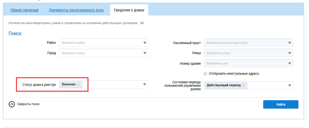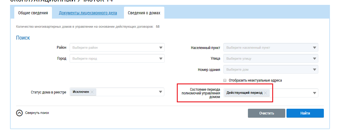 Также возможна ситуация, когда статус дома «Исключен», при этом статус дома в реестре — «Действующий период». При ней дом также будет числиться в управлении Вашей организации. Решением вопроса является присвоение состояния периода полномочий «Период управления истек» органами ГЖИ.
