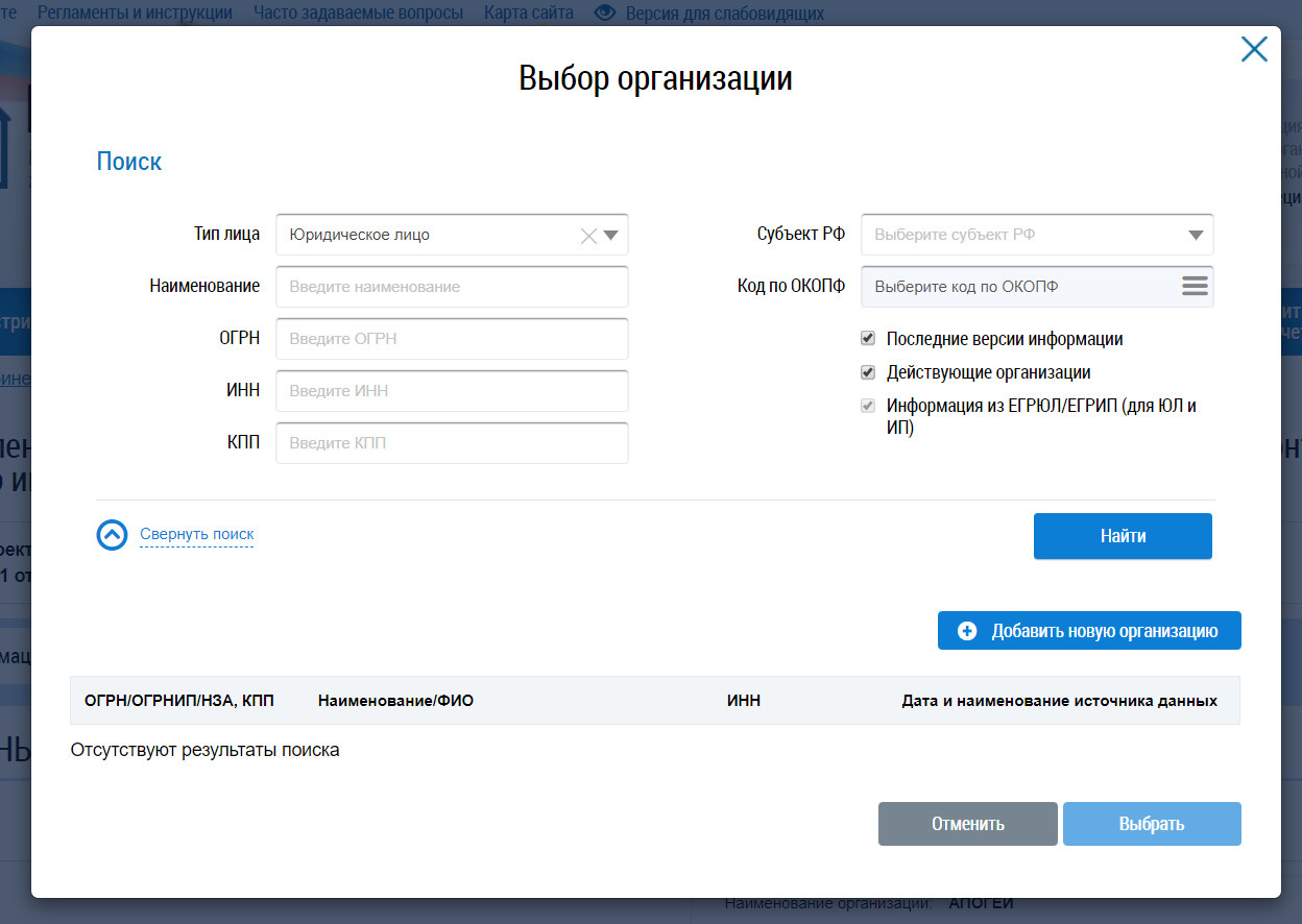 Если поиск по заданным критериям не дает результатов, необходимо направить обращение в службу поддержки ГИС ЖКХ с просьбой добавить нужного контрагента, указав его наименование и ОГРН/ОГРНИП.