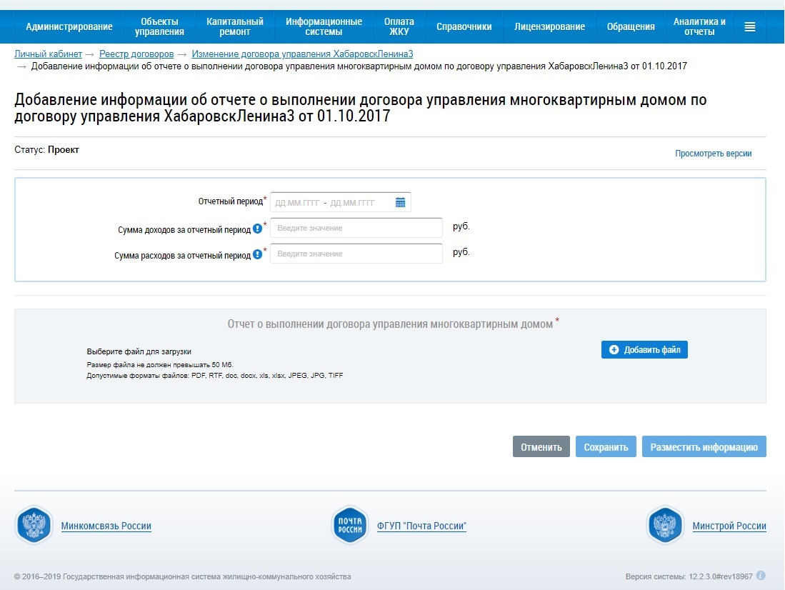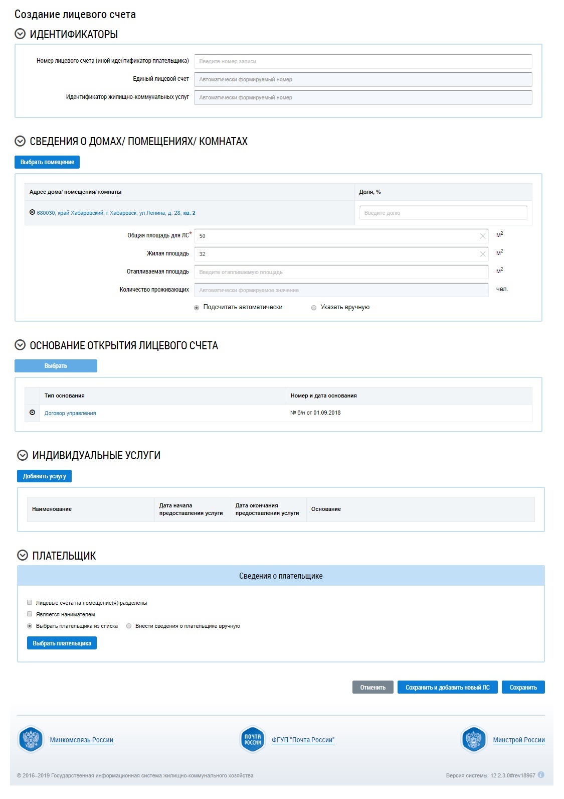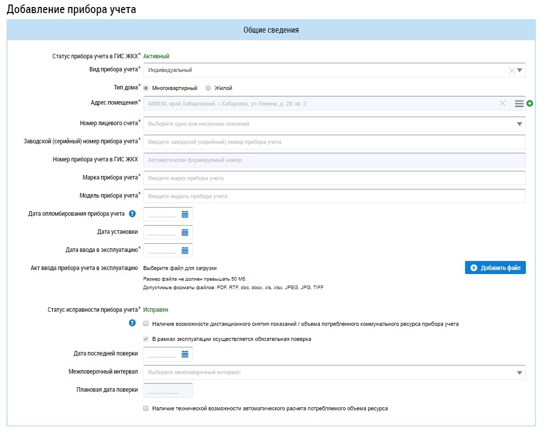 Индивидуальный относится к помещениям с типом «Отдельная квартира». Коллективный (общедомовой) и группа приборов учета «Общий (квартирный) и комнатный» — к квартирам коммунального заселения. Для размещения информации требуются данные о заводском (серийном) номере прибора учета, марке, модели, дате ввода в эксплуатацию, межпроверочном интервале, базовом показании.